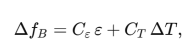 Along a bonded sensing cable, the Brillouin frequency shift Δf_B varies approximately linearly with mechanical strain ε and temperature T: