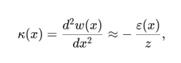 and bending stress σ(x,z)=E z κ(x); integrating κ(x) twice with appropriate boundary conditions gives the deflection w(x).