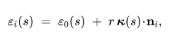 A tri-core fibre with FBG triplets provides three colocated axial strains εi at core positions ri (equilateral triangle, radius r from fibre centroid). The curvature vector κ(s) at arc-length s follows from
