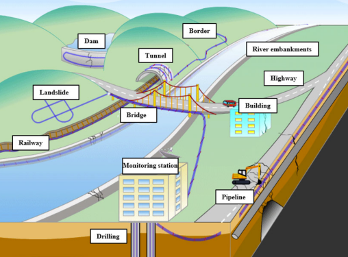 · Bridges (girders/deck): run DSS on the tension and compression faces of main girders (e.g., soffit midspan for sagging; web/diaphragm lines over supports), add a reference thermal run in the same micro-climate but mechanically isolated for ΔT separation; typical spatial resolution 0.5–1.0 m, gauge length 5–10 m for BOTDA.