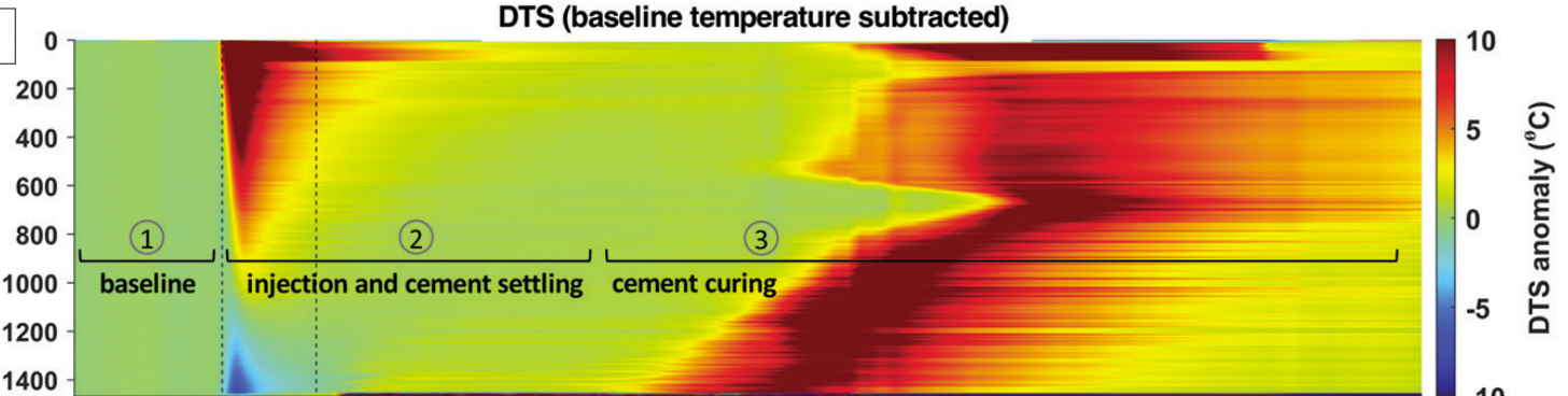 DTS (temperature) — cement hydration and fluid interfaces. Because cement hydration generates a transient exotherm in T(z,t)T(z,t) which rises to a peak and then relaxes, and because displacement fronts introduce step-like thermal contrasts, TOC and set timing can be inferred by criteria based upon the temporal gradient ∂T/∂t\partial T/\partial t, the integral of the excess heat and a “half-cooling time” threshold, which in combination yield depth–time bounds on placement and set without intrusive logging.
